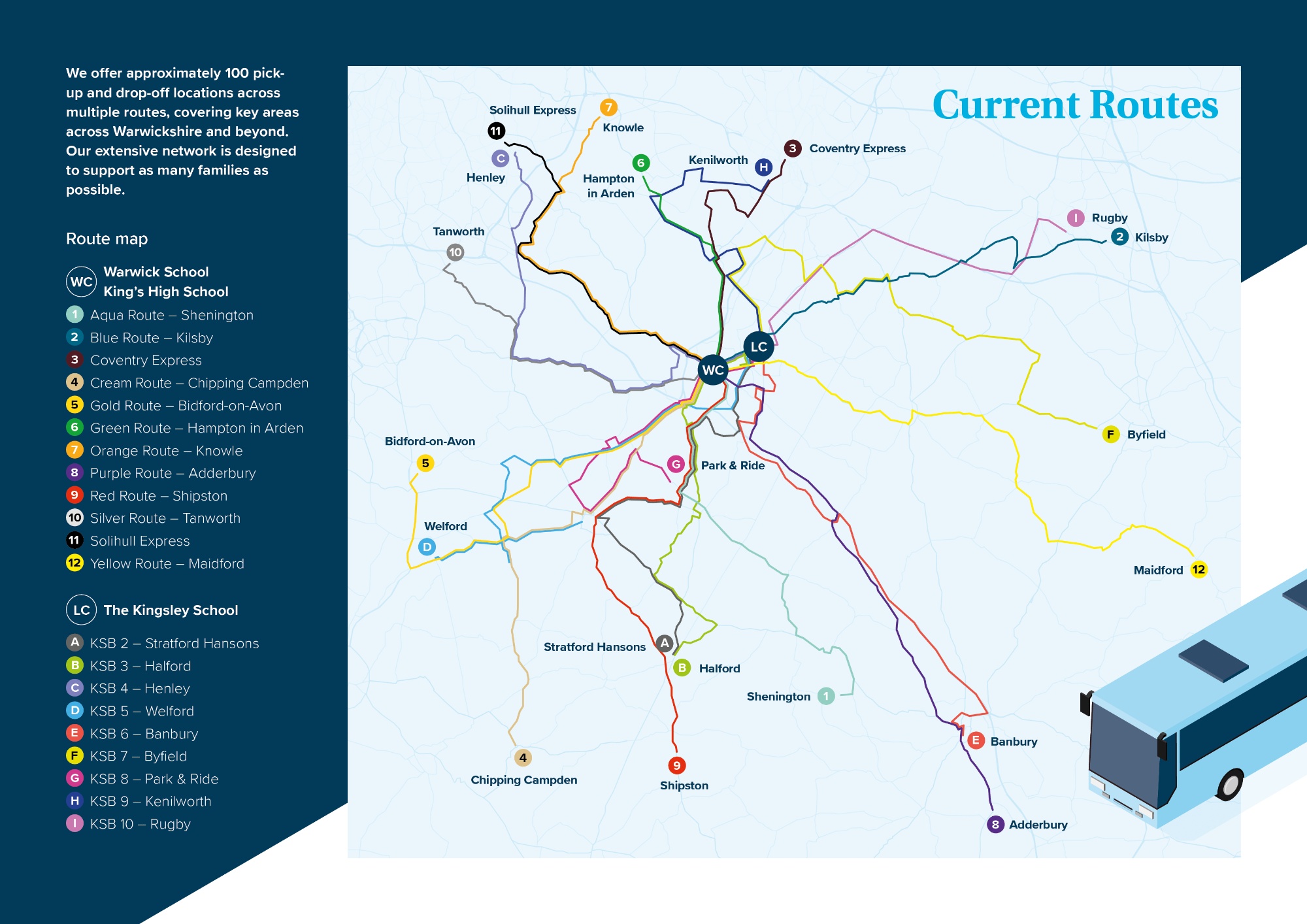 Routes are reviewed regularly throughout the academic year and planned in advance of each school year. They may be adjusted in response to demand, traffic conditions or operational requirements. Families will always be informed in advance of any changes.